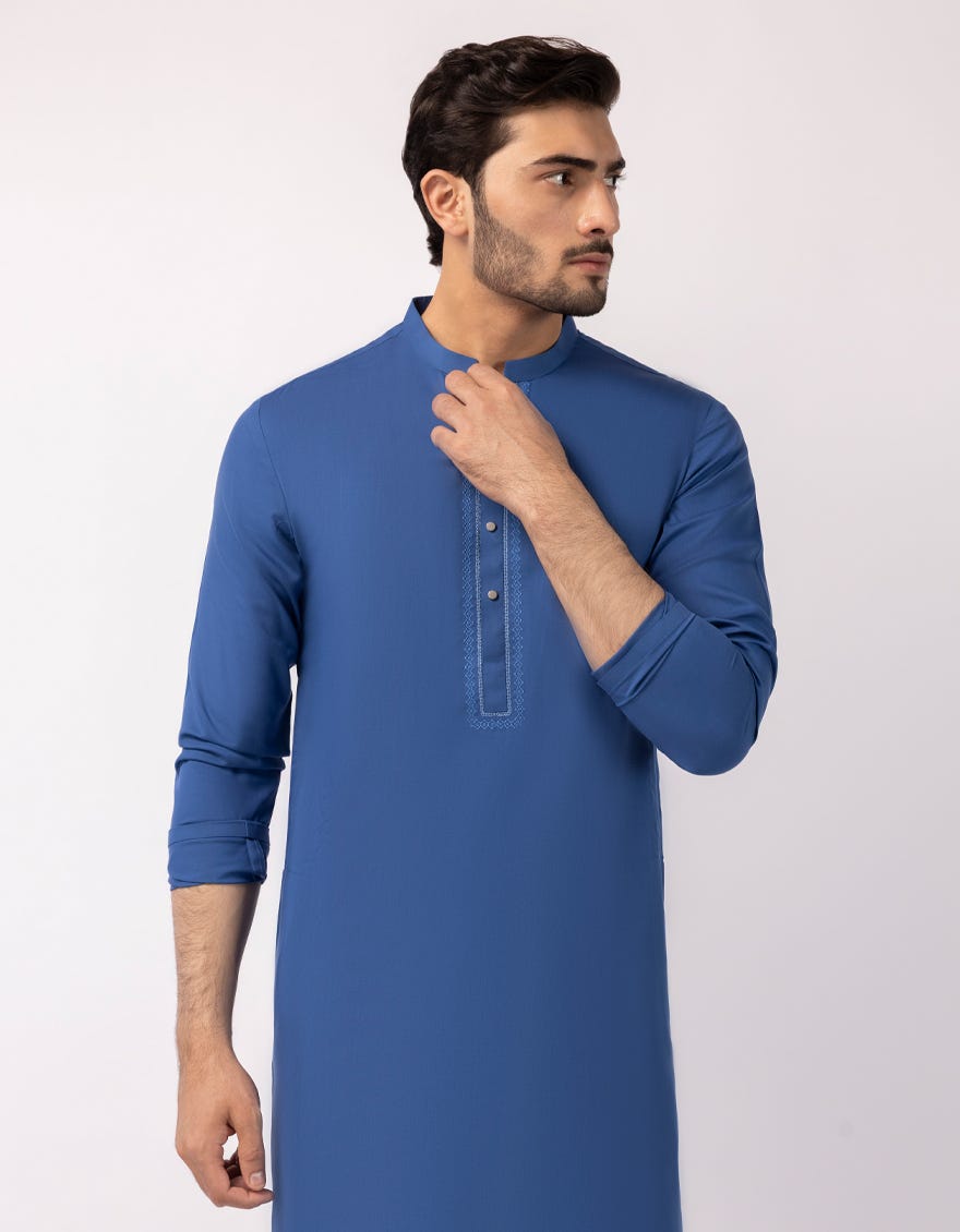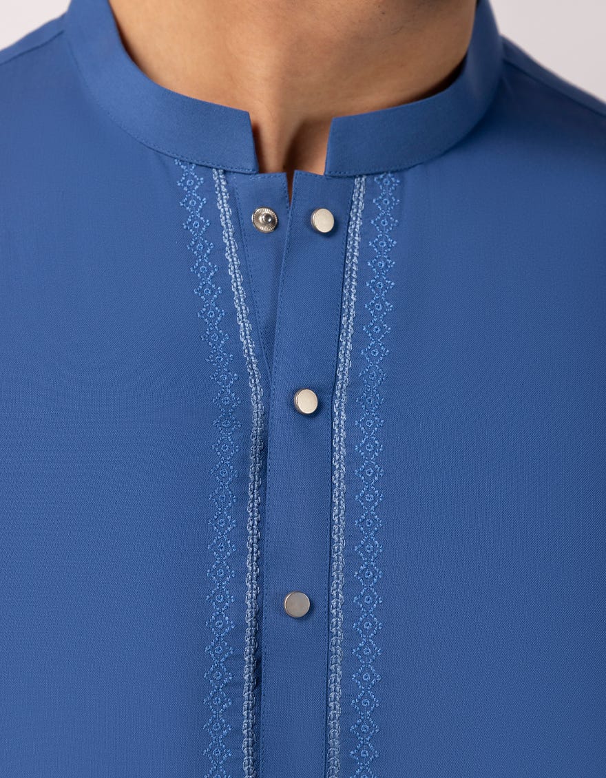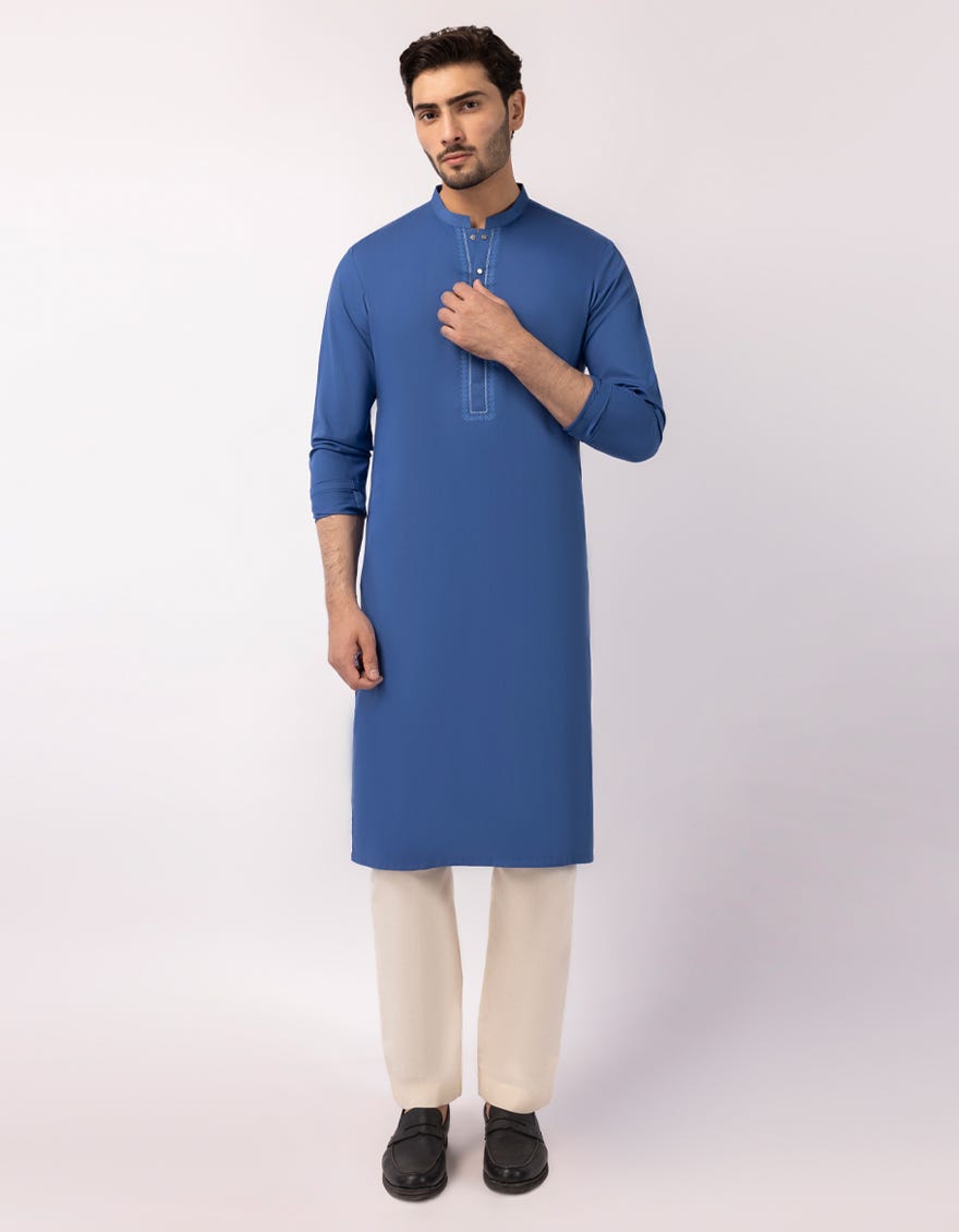 A semi-formal kurta enhanced with embroidery applied on the front. The subtle detailing adds refinement while keeping the kurta versatile for semi-formal and festive events.