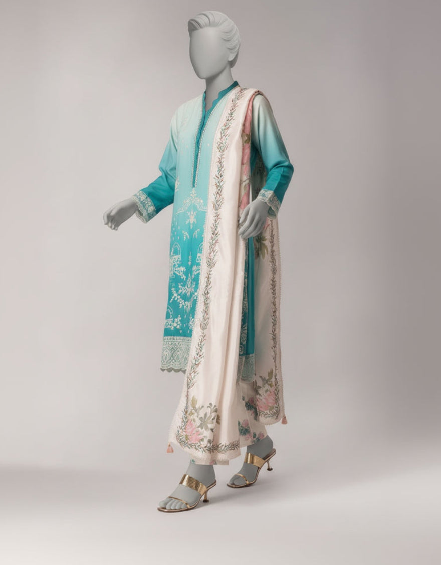 Schiffli Embroidered Digital Printed Lawn Shirt: 3 Meters