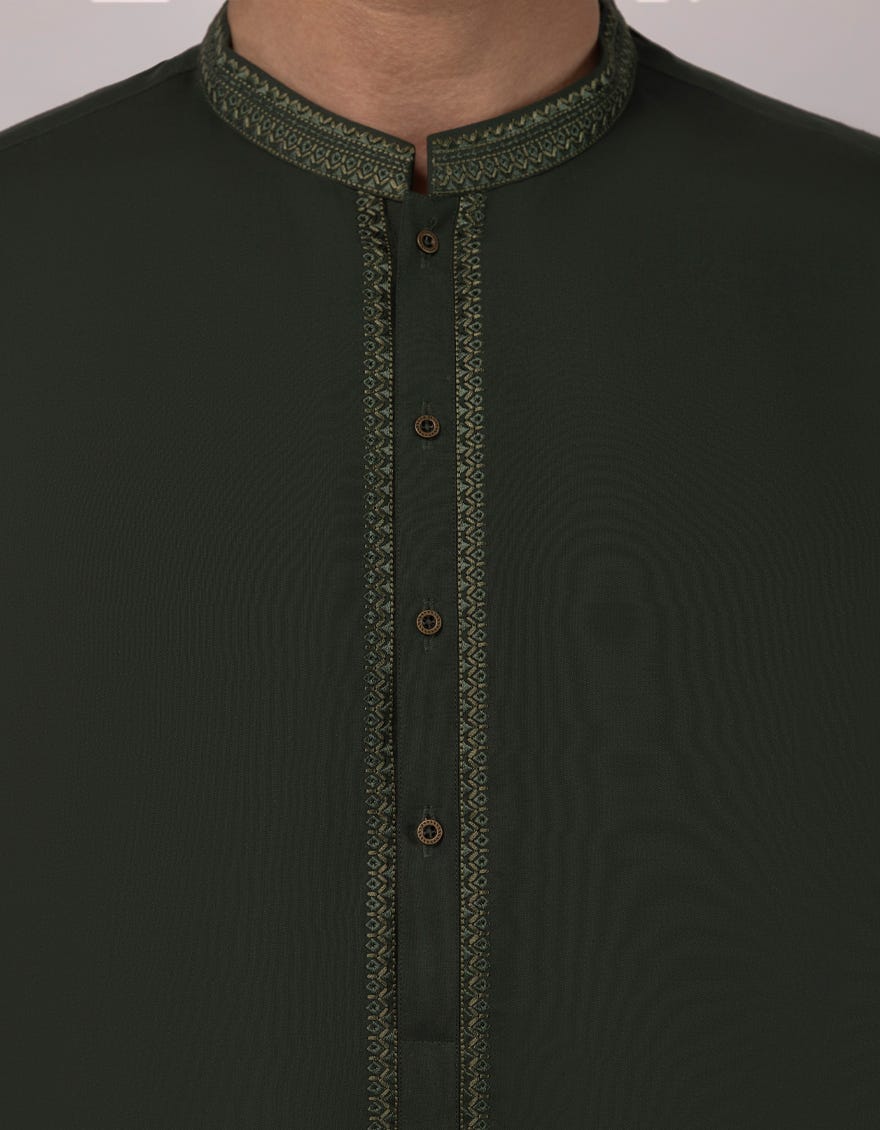 A semi-formal kurta stylized with embroidery on the collar and front panel. The elegant design balances traditional charm with modern appeal, making it perfect for festive and formal occasions.